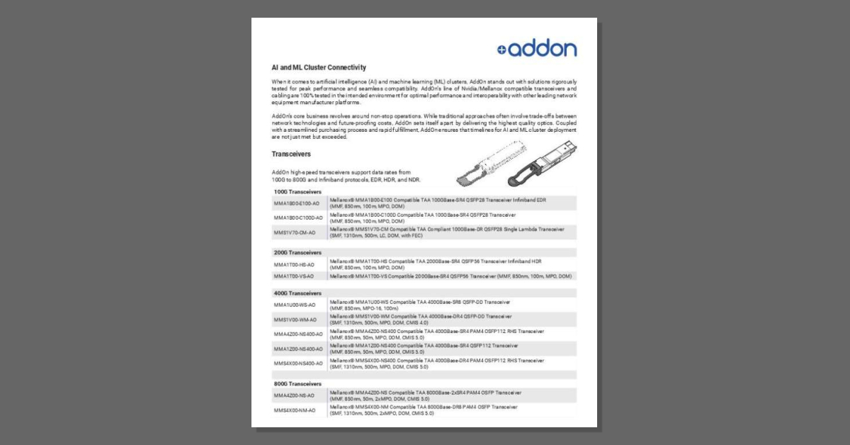 AI and ML clusters depend on consistent, high-performance connectivity to deliver results. The AddOn brochure highlights transceivers and cabling tested in real environments to ensure interoperability across leading platforms. It shows how validated solutions support reliable performance and faster deployment timelines. Read the brochure to understand how connectivity choices impact AI and ML outcomes.